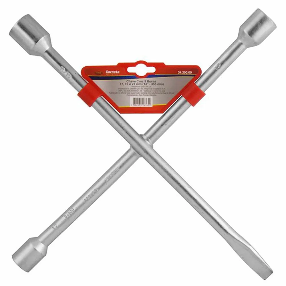 Chave Cruz 3 Bocas é ideal para apertar e soltar parafusos de rodas de veículos. Fabricada em aço cromo vanádio e totalmente temperada garante resistência e durabilidade. Possui formato em cruz que facilita no uso fazendo o aperto ou retirada dos parafusos com muita facilidade.